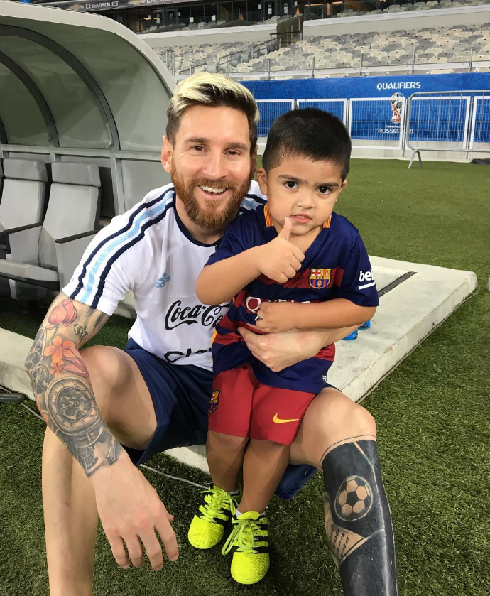 Messi também posou para fotos com o pequeno Valentino, filho do atacante do Cruzeiro (Foto: Reprodução/Internet)