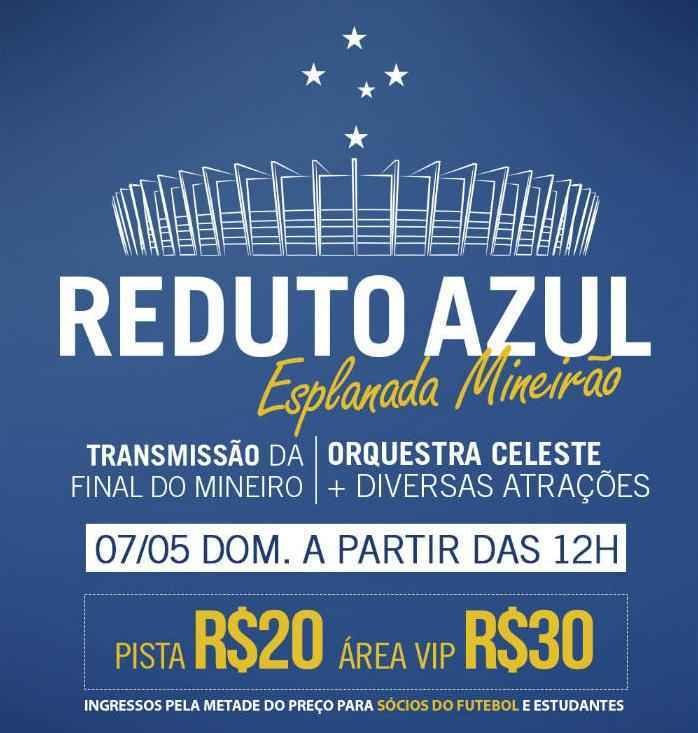 O Cruzeiro anunciou, na manhã desta quinta-feira, que instalará telões na esplanada do Mineirão para a transmissão da final do Campeonato Mineiro contra o Atlético, no domingo, às 16h. O evento no Gigante da Pampulha começará quatro horas antes do início da partida e contará com apresentações musicais.