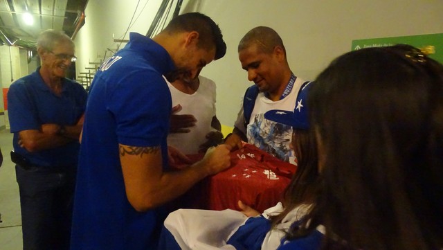 Os fãs do jogador atenderam, fizeram fila e se organizaram. Então, vamos lá. Era um tal de sorriso, flash e foto, em uma sequência que parecia não ter fim. Tinha a turma dos autógrafos. Era assinatura na camisa azul, tradicional, mas também na amarela e na vinha - já usadas pelo goleiro - e na branca também. Aproximadamente 30 pessoas rodearam o jogador e, com cada uma delas, multiplicavam-se o número de cliques.