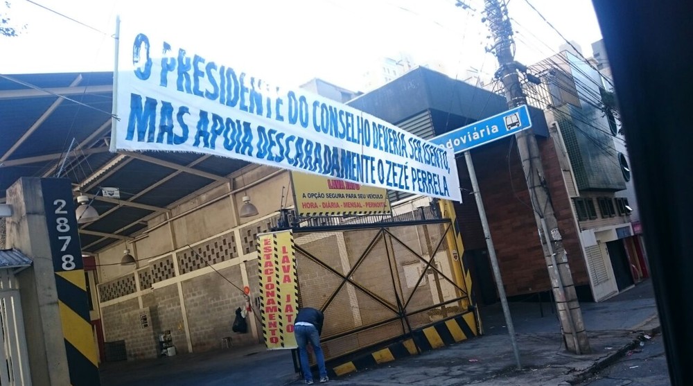 Três faixas foram estendidas, nesta quarta-feira, no quarteirão onde está localizada a sede administrativa do Cruzeiro, no Barro Preto, região central de Belo Horizonte. Anônimas, pediam suspensão dos seis conselheiros do clube investigados na delação da empresa JBS, cujo desdobramento do último dia 18, com mandados de prisão e busca e apreensão de documentos, revelou o envolvimento dos seis integrantes do conselho. São eles: o senador e ex-presidente do clube, Zezé Perrella, e o filho Gustavo Perrella, o senador afastado Aécio Neves, Mendherson Souza Lima (assessor de Zezé Perrella), Frederico Pacheco de Medeiros (primo de Aécio Neves) e Euller Nogueira Mendes.
