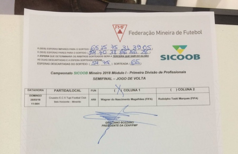 Apenas dois nomes participaram do sorteio. E quem vai apitar Cruzeiro x Tupi - que se enfrentam às 11h de domingo no Mineirão - será o carioca Wagner do Nascimento Magalhães (FIFA). A outra opção era o paranaense Rodolpho Toski Marques (FIFA). Itair Machado e Sérgio Nonato, diretores do Cruzeiro, estiveram presentes ao sorteio.