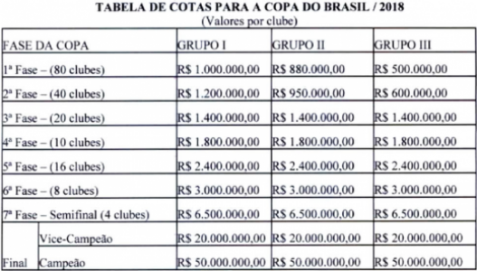 A premiação está entre as maiores em torneios da América do Sul. O total de valor distribuído na Copa do Brasil 2018 aos 91 participantes foi de R$ 278.290.000,00.