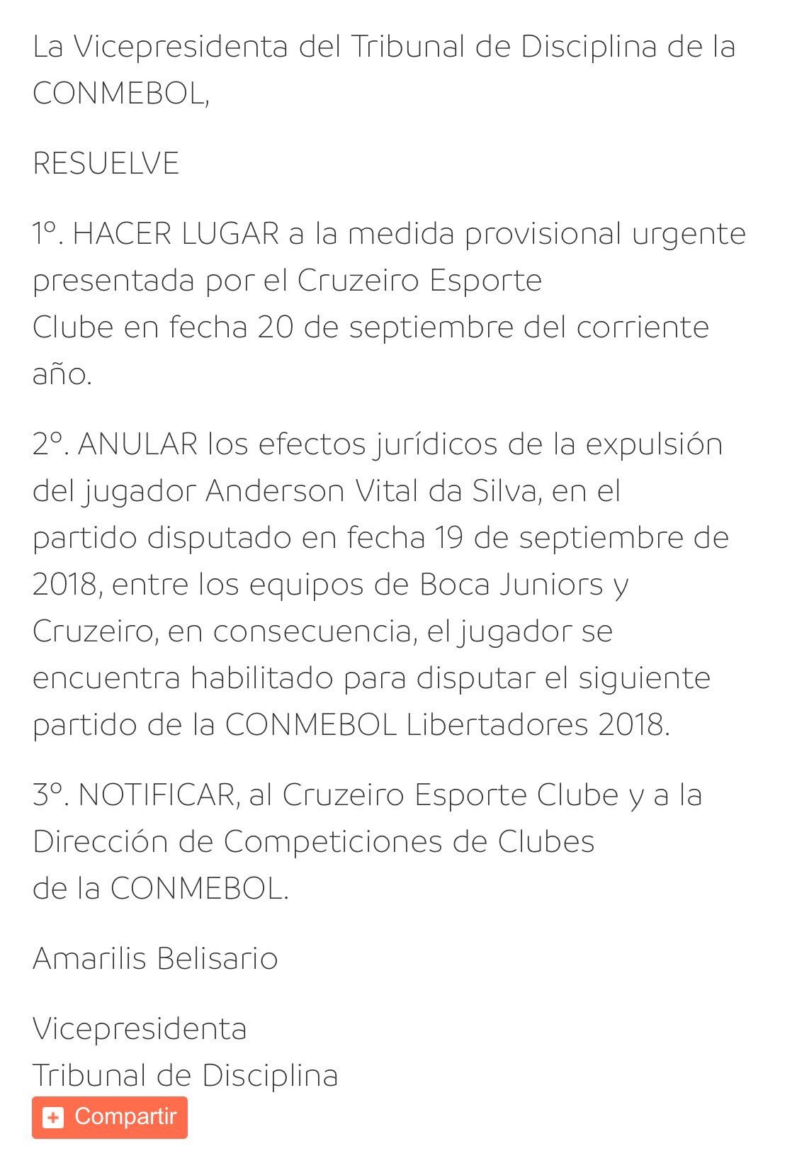 Uma semana após o equívoco dos árbitros paraguaios Eber Aquino (principal) e Mario Díaz de Vivar (responsável pelo VAR) na decisão de expulsar o zagueiro Dedé, do Cruzeiro, por choque acidental com o goleiro Andrada, do Boca Juniors, na Bombonera, no jogo de ida das quartas de final da Copa Libertadores, a Confederação Sul-Americana de Futebol (Conmebol) decidiu anular o cartão vermelho do jogador. Assim sendo, ele poderá jogar a partida de volta da competição.