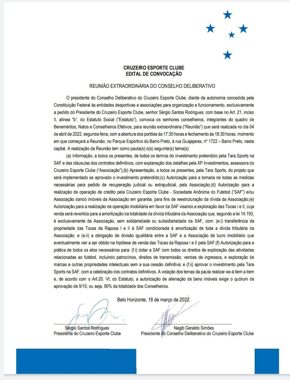 O Conselho Deliberativo do Cruzeiro publicou, neste sábado, edital de convocação para reunião extraordinária no dia 4 de abril. O encontro irá votar algumas mudanças desejadas por Ronaldo para viabilizar a SAF.