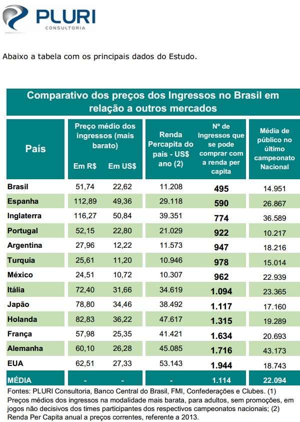 Os brasileiros recebem, em média, US$ 11.208 por ano, o que lhes permite comprar somente 495 ingressos por temporada. Esta, sim, é a menor quantidade na comparação com os outros países analisados. Isto faz do Brasil o país com os ingressos mais caros do planeta.