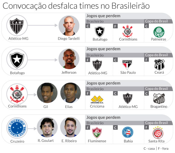 Além de Cruzeiro e Corinthians, Botafogo e Atlético-MG também tiveram jogadores chamados por Dunga: o goleiro Jefferson (não joga contra Atlético-MG e São Paulo) e o atacante Diego Tardelli (desfalque contra Botafogo e Corinthians), respectivamente.
