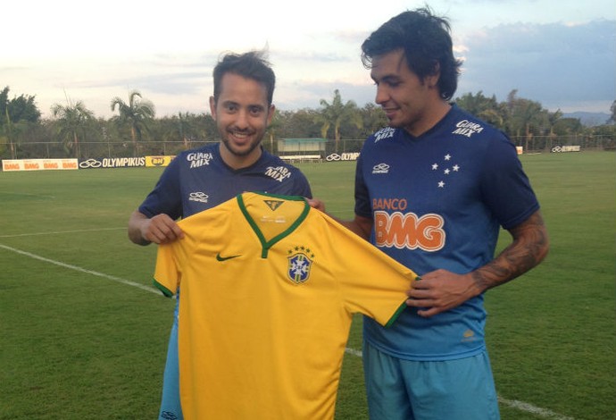 Éverton Ribeiro e Ricardo Goulart posam com a camisa da seleção brasileira na Toca (Foto: Divulgação Cruzeiro)