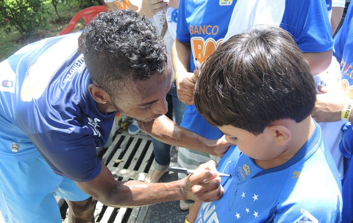 Marquinhos autografa camisa de torcedor do Cruzeiro após treinamento (Foto: Alexandre Alliatti)