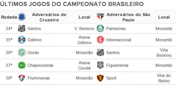 Faltam cinco partidas para o fim da disputa. Se administrar a vantagem sem sair da ponta e garantir o tetracampeonato nacional, o Cruzeiro vai chegar à marca recorde de 33 rodadas seguidas na liderança do Brasileirão. Até o fim desta edição do campeonato, o líder ainda joga cinco vezes, sendo duas em casa e três fora. No próximo domingo, o time celeste vai a São Paulo para encarar o Santos, na Vila Belmiro. Depois enfrenta o Grêmio em Porto Alegre (confira os próximos jogos da Raposa e do Tricolor no Campeonato Brasileiro na tabela abaixo). Na próxima quarta-feira, a equipe do técnico Marcelo Oliveira enfrenta o Atlético-MG, às 22h (de Brasília), no primeiro confronto da decisão da Copa do Brasil, no Independência, em Belo Horizonte.