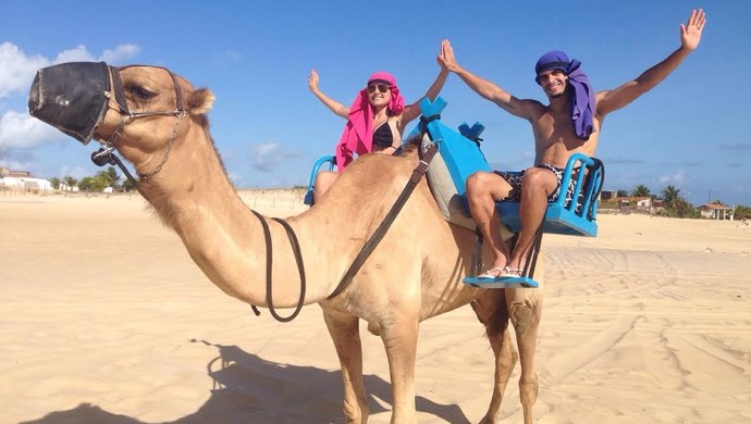 Egídio, lateral do Cruzeiro, com a esposa Thaysa, andando de dromedário em Natal-RN (Foto: Divulgação)