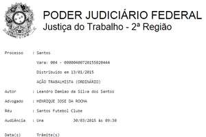 O atacante Leandro Damião resolveu acionar judicialmente o Santos nesta terça-feira. Emprestado ao Cruzeiro, o ex-camisa 9 é o quarto jogador que atuou na última temporada a entrar com um processo trabalhista contra o clube, seguindo as medidas já adotadas pelo volante Arouca, o lateral esquerdo Eugenio Mena e o goleiro Aranha. O processo corre na 4ª Vara de Santos e já tem audiência marcada para 30 de março.