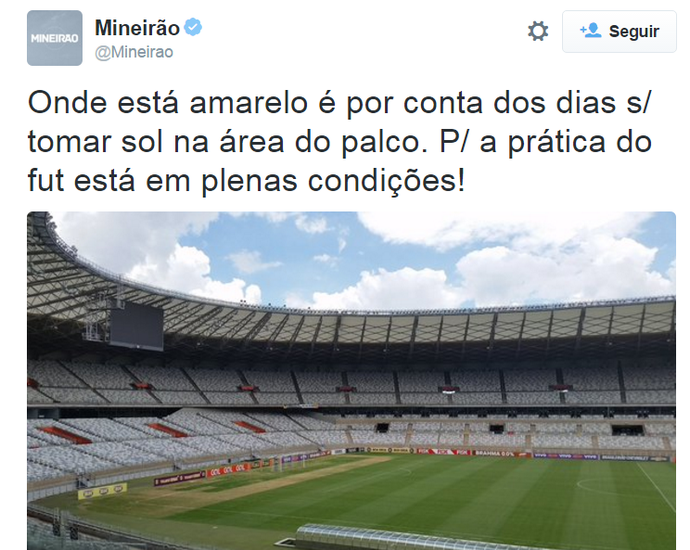 Segundo a administradora, parte do campo ficou sem tomar sol durante os dias em que o estádio foi cedido para a montagem do palco e apresentação da banda norte-americana Pearl Jam, em Belo Horizonte, na última semana. Por causa disso, a grama ficou amarelada. A Minas Arena fez questão de destacar que o gramado está em "plenas condições" para a prática do futebol.