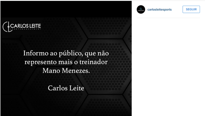 POR, entre outros, anunciou o fim da parceria com o treinador via Instagram. Sem a participação de Leite, Mano aguarda a definição de alguns detalhes, entre eles a multa de R$ 7 milhões com o Cruzeiro, para confirmar o acerto com o novo clube. Na China, Mano vai receber cerca de R$ 2 milhões mensais em quatro anos de contrato.