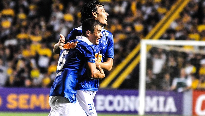 Ricardo Goulart e Egídio comemoram gol da vitória do Cruzeiro contra Criciúma em 2013 (Foto: Eduardo Valente)