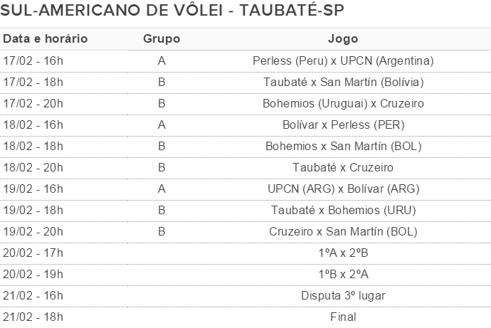 – O UPCN é uma equipe forte, é o atual campeão e é um dos favoritos, ao lado das equipes brasileiras e do Bolívar. Em todos os campeonatos Sul-Americanos e sempre fizeram jogos muito equilibrados – disse o técnico do Taubaté, Cezar Douglas.