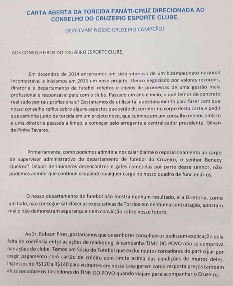 “Ao Sr. Robson Pires, gostaríamos que os senhores conselheiros pedissem explicação pela falta de coerência entre as ações de marketing. A campanha Time do Povo não se comprova nas ações do clube. Temos um Sócio do Futebol que exclui muitos torcedores de participar por exeigir pagamento com cartão de crédito com limite acima das condições de muitos deles. Ingressos de R$ 120 e R$ 140 para visitantes em nossa casa gera como resposta preços também abusivos sobre torcedores do time do povo quando viajam para acompanhar o Cruzeiro”, diz trecho da carta.