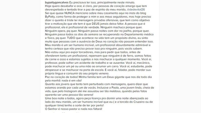 Menos de um dia após a mulher do meia Paulo Henrique Ganso ir as redes sociais para desabafar contra os críticos do marido, a esposa do zagueiro Dedé, Patrícia Gonçalves, também recorreu à internet para lamentar as duras críticas que o companheiro vem sofrendo de parte dos torcedores do Cruzeiro - na página do Instagram dele e dela.