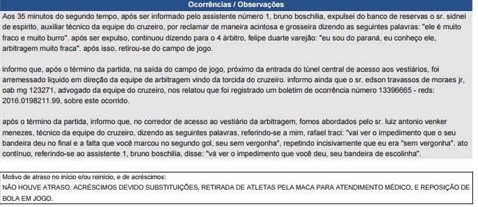 - Aos 35 minutos do segundo tempo, após ser informado pelo assistente número 1, Bruno Boschilia, expulsei do banco de reservas o sr. Sidnei de Espírito, auxiliar técnico da equipe do Cruzeiro, por reclamar de maneira acintosa e grosseira dizendo as seguintes palavras: "ele é muito fraco e muito burro". Após ser expulso, continuou dizendo para o 4º árbitro, Felipe Duarte Varejão: "eu sou do Paraná, eu conheço ele, arbitragem muito fraca.